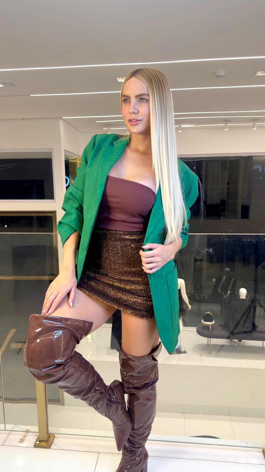 saia bege é confeccionada em tecido leve com superfície em paetês. A peça possui cintura alta,  forro, comprimento curto, shape solto e fechamento posterior por zíper invisível.
