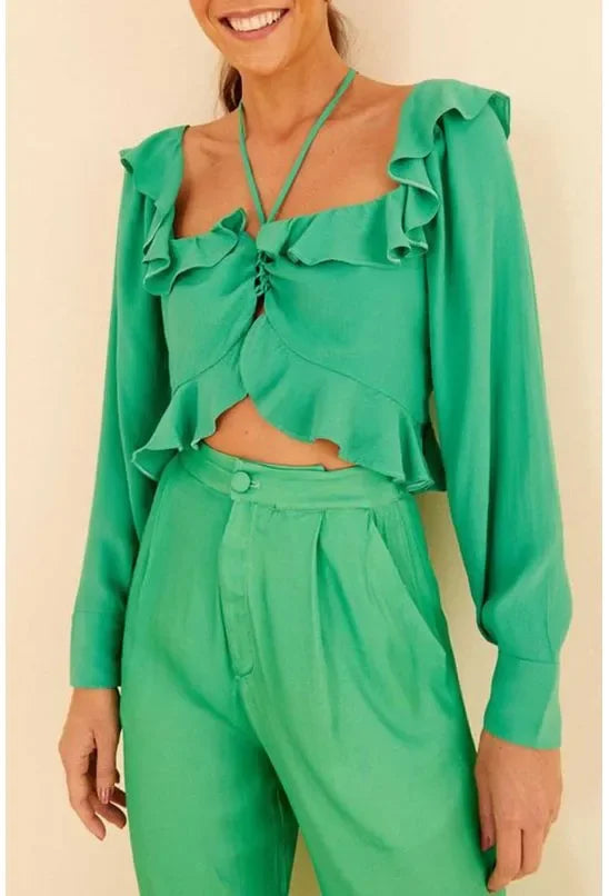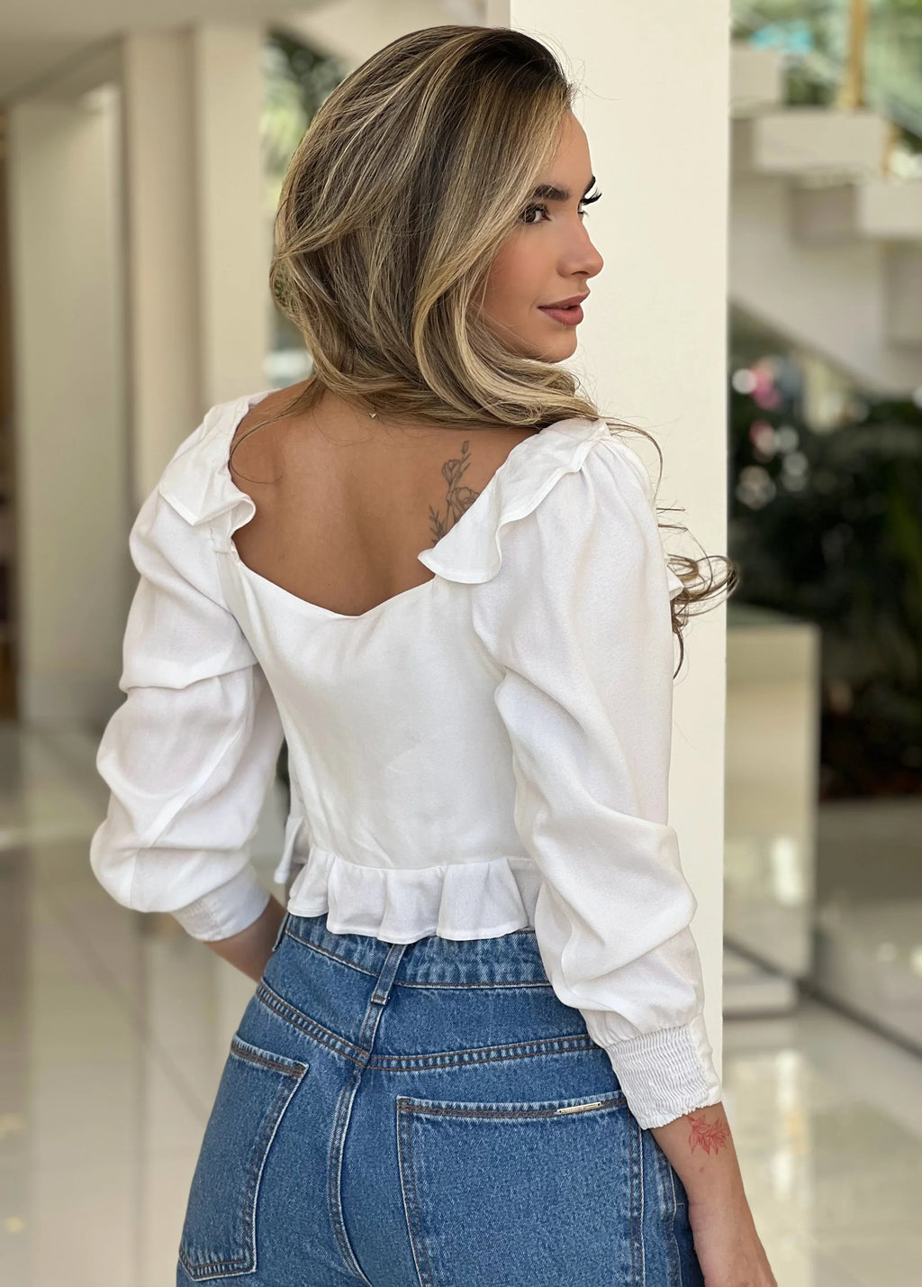 blusa cropped babado amarração. possui decote quadrado com acabamento de babado peplum acompanhando todo o decote. tem abertura no meio do busto ajustado.