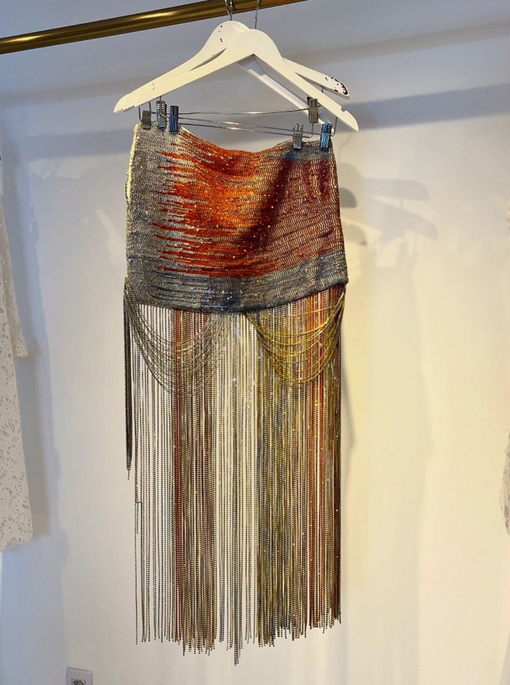 A Saia Espectro Lopez é puro impacto e sofisticação. Toda confeccionada em estrass ela traz um degradê de cores intensas que se transformam conforme a luz. O destaque fica por conta das franjas longas em strass, que garantem movimento, brilho e um toque ousado a cada passo.