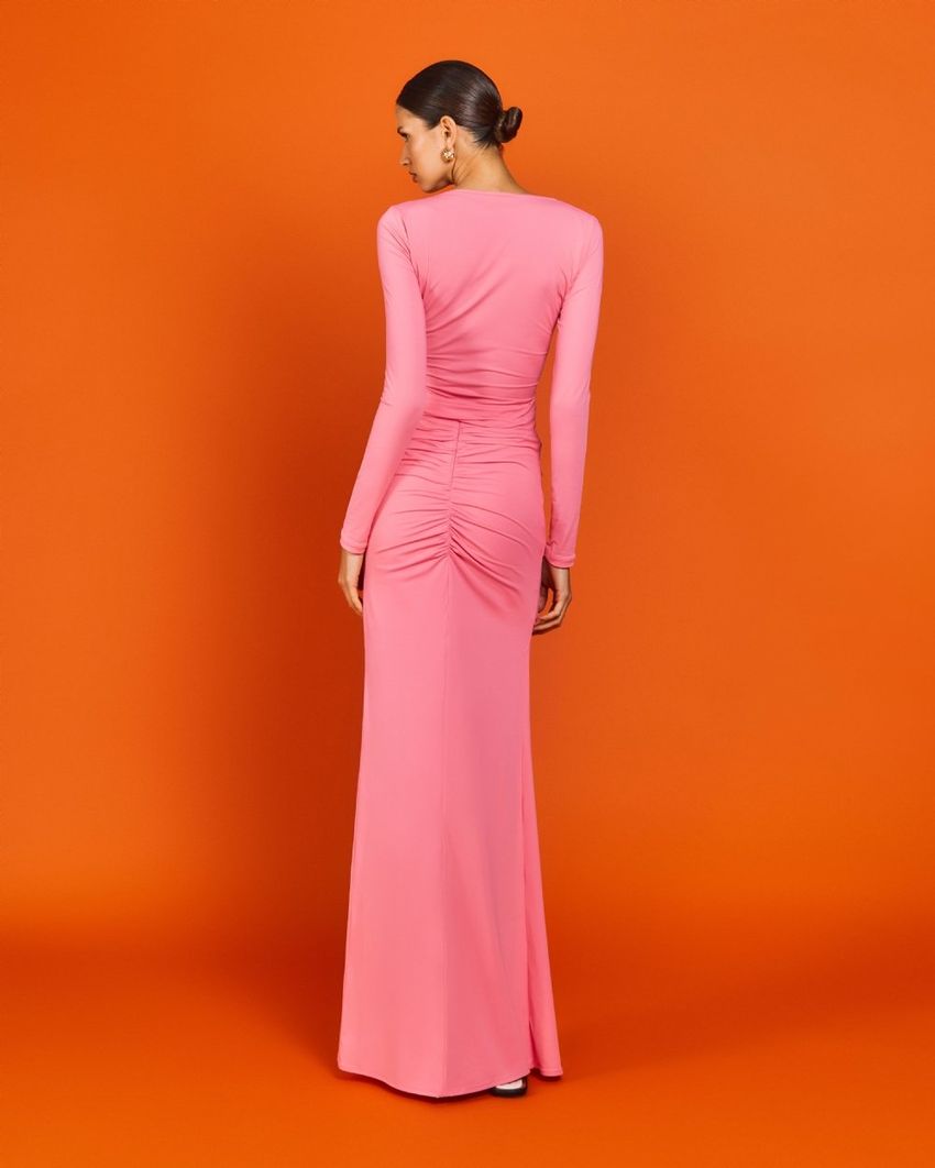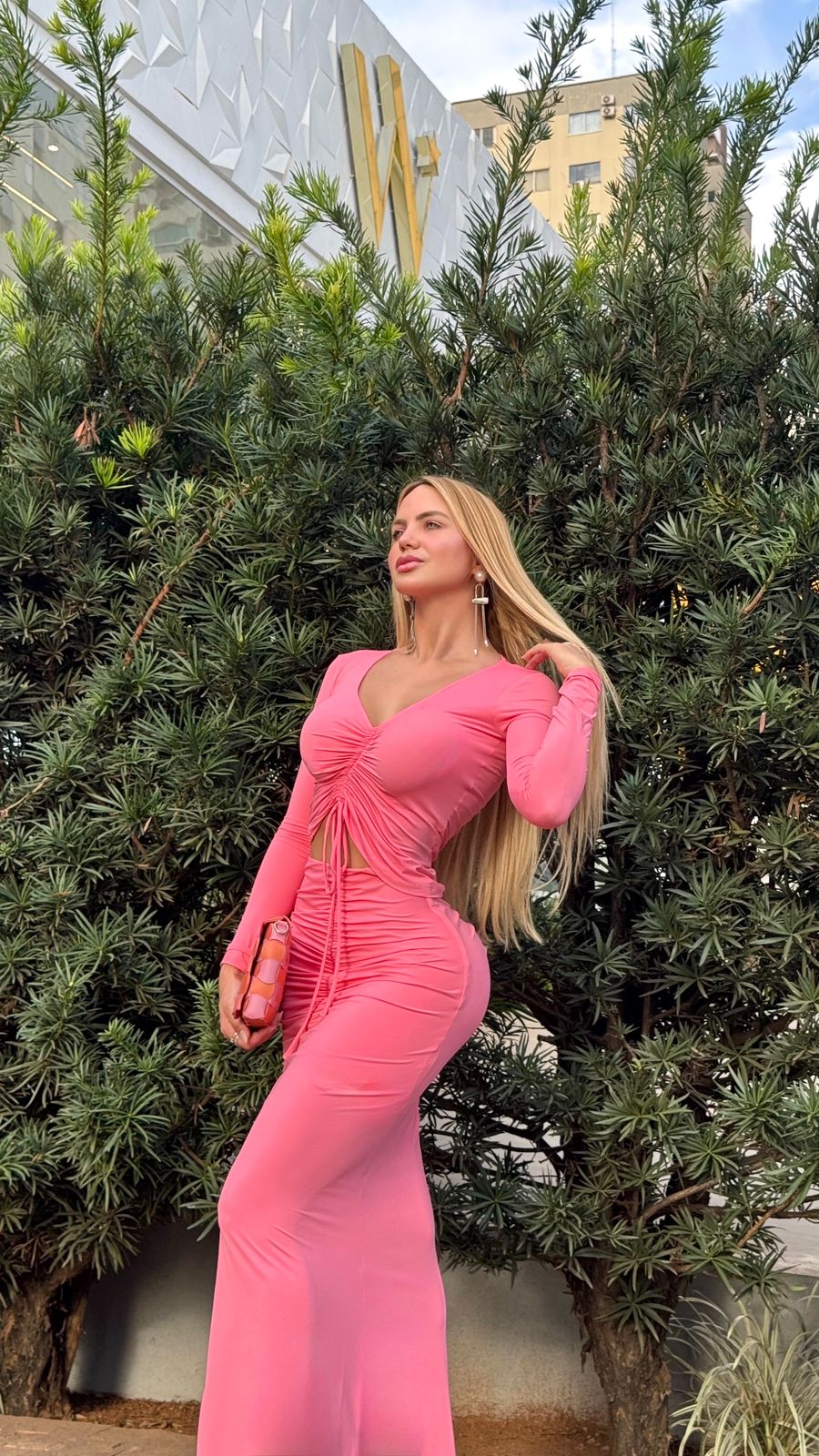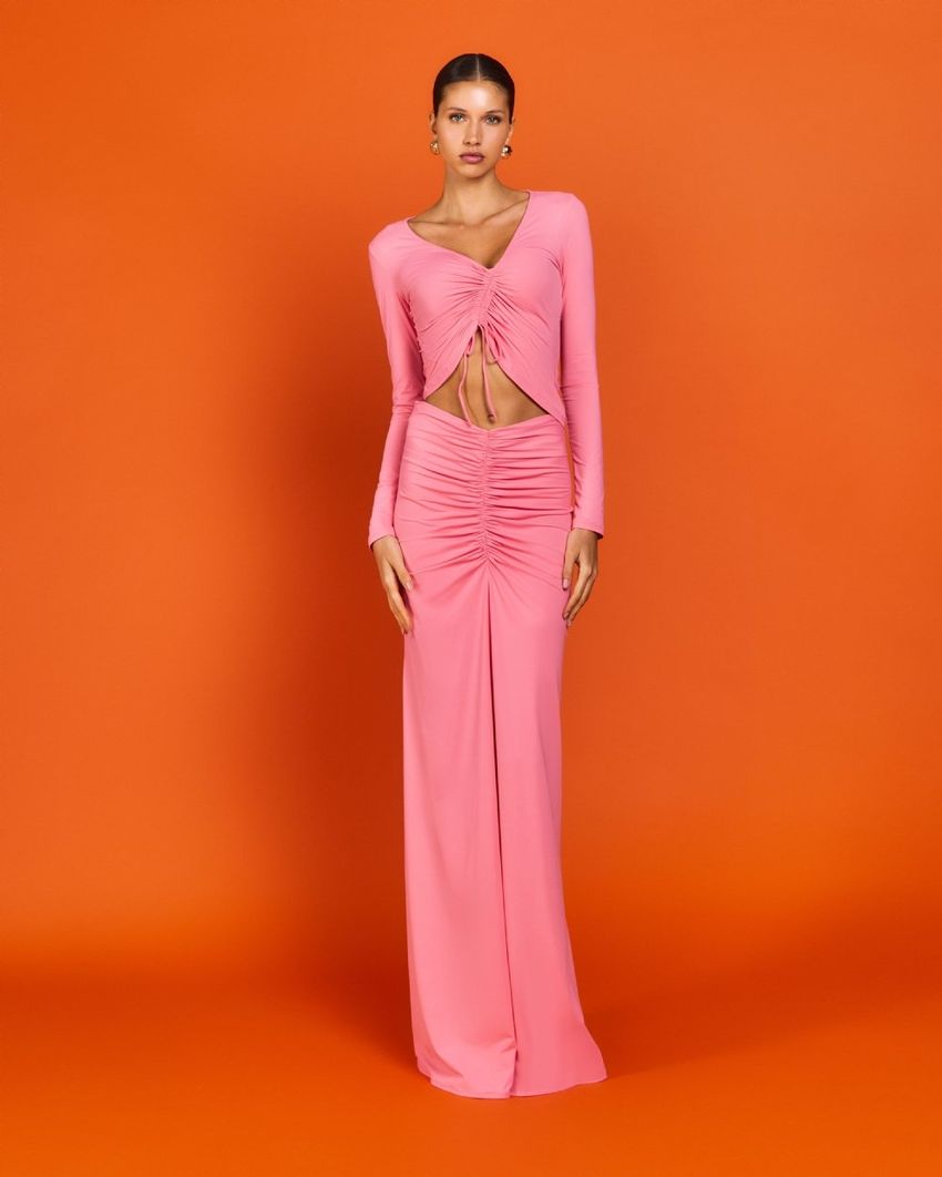 saia longa em jersey  combina conforto e impacto visual. Com  franzido central que valoriza a silhueta  e fenda discreta para o movimento, uma peça traz elegância contemporânea e caimento fluido. Versátil, pode ser usado tanto em produções sofisticadas quanto em composições mais modernas e despojadas.